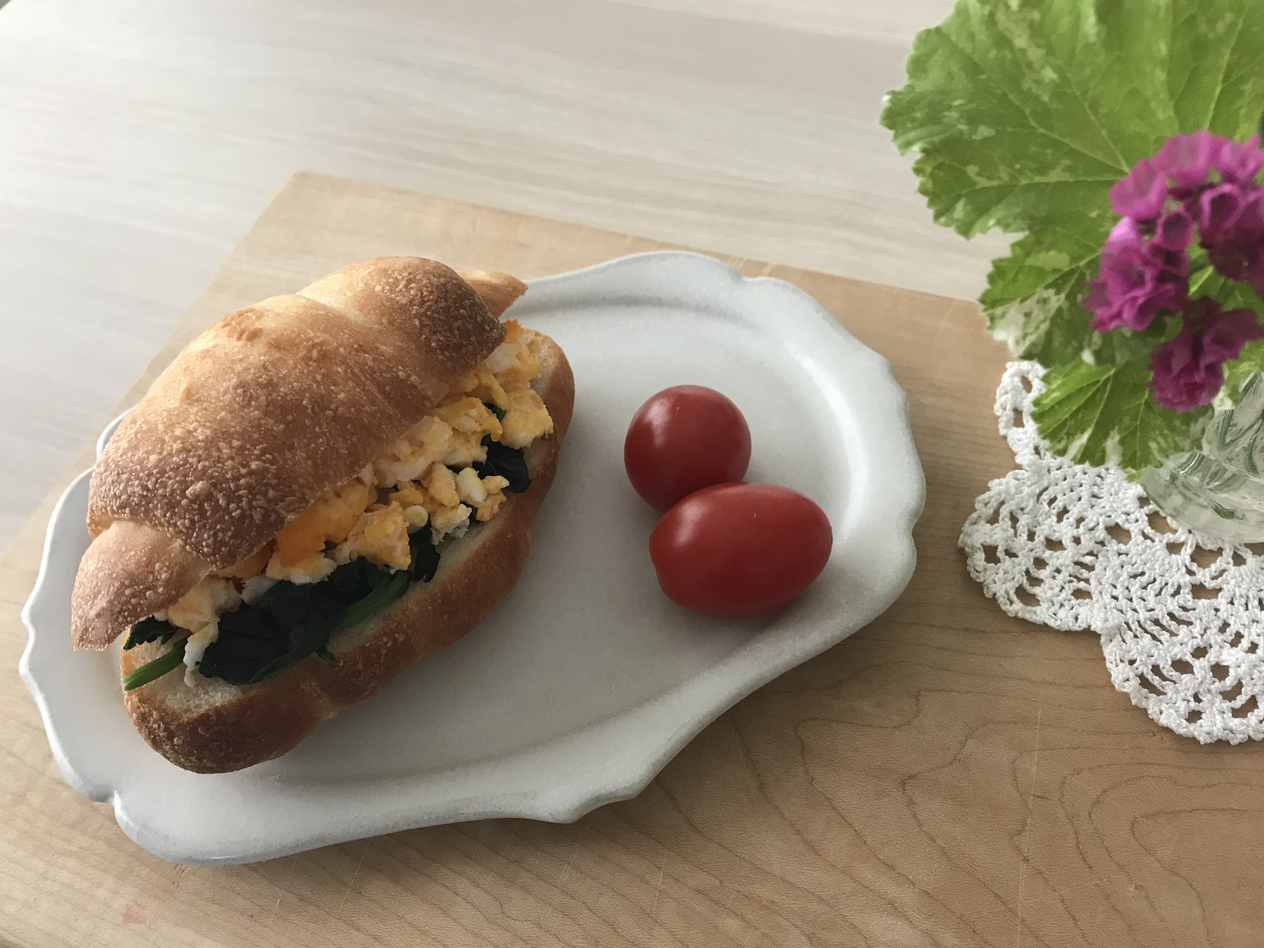 次の日の朝は塩パンサンドで朝食。ほうれん草のソテーと炒り卵を挟みました。