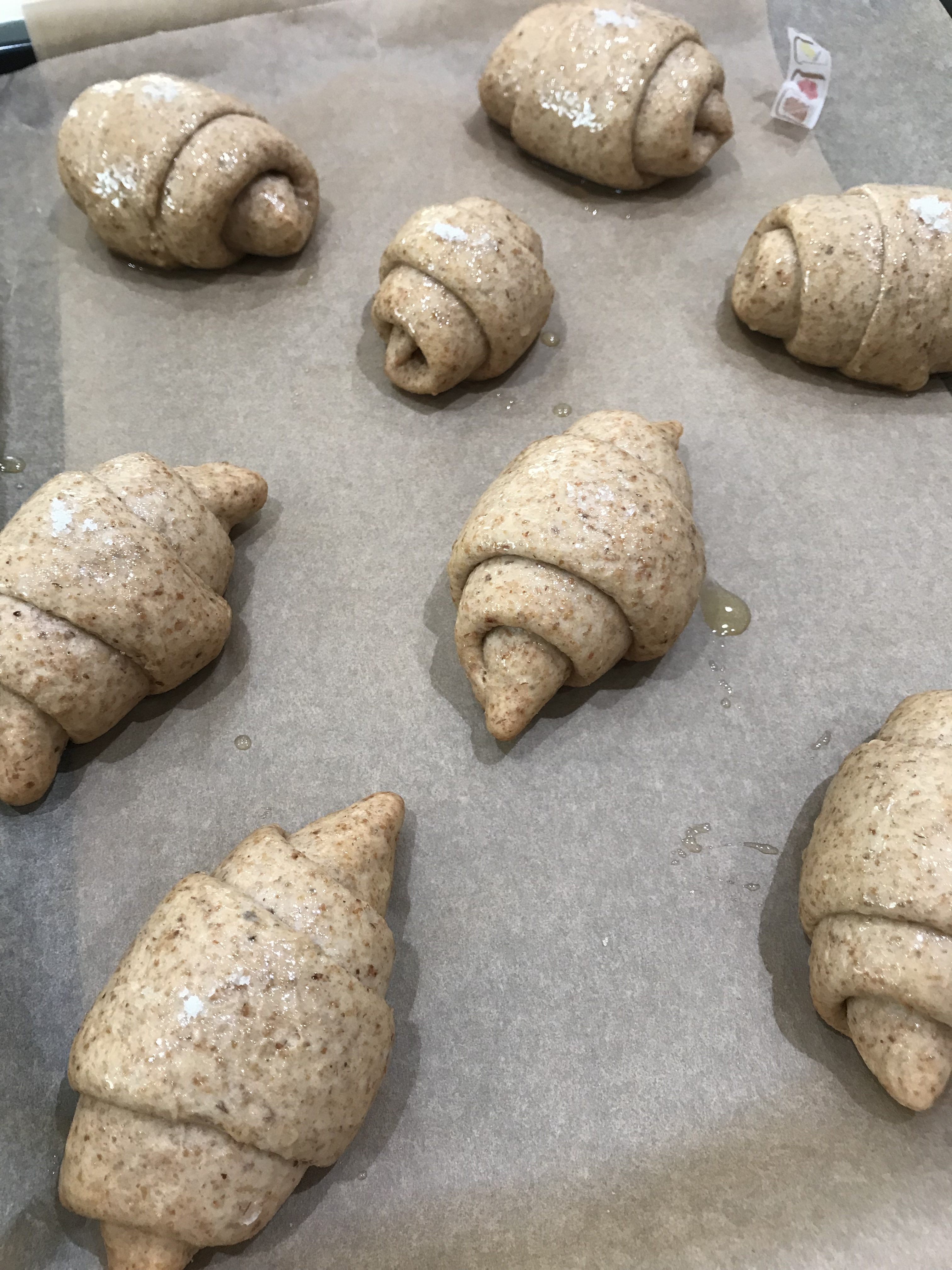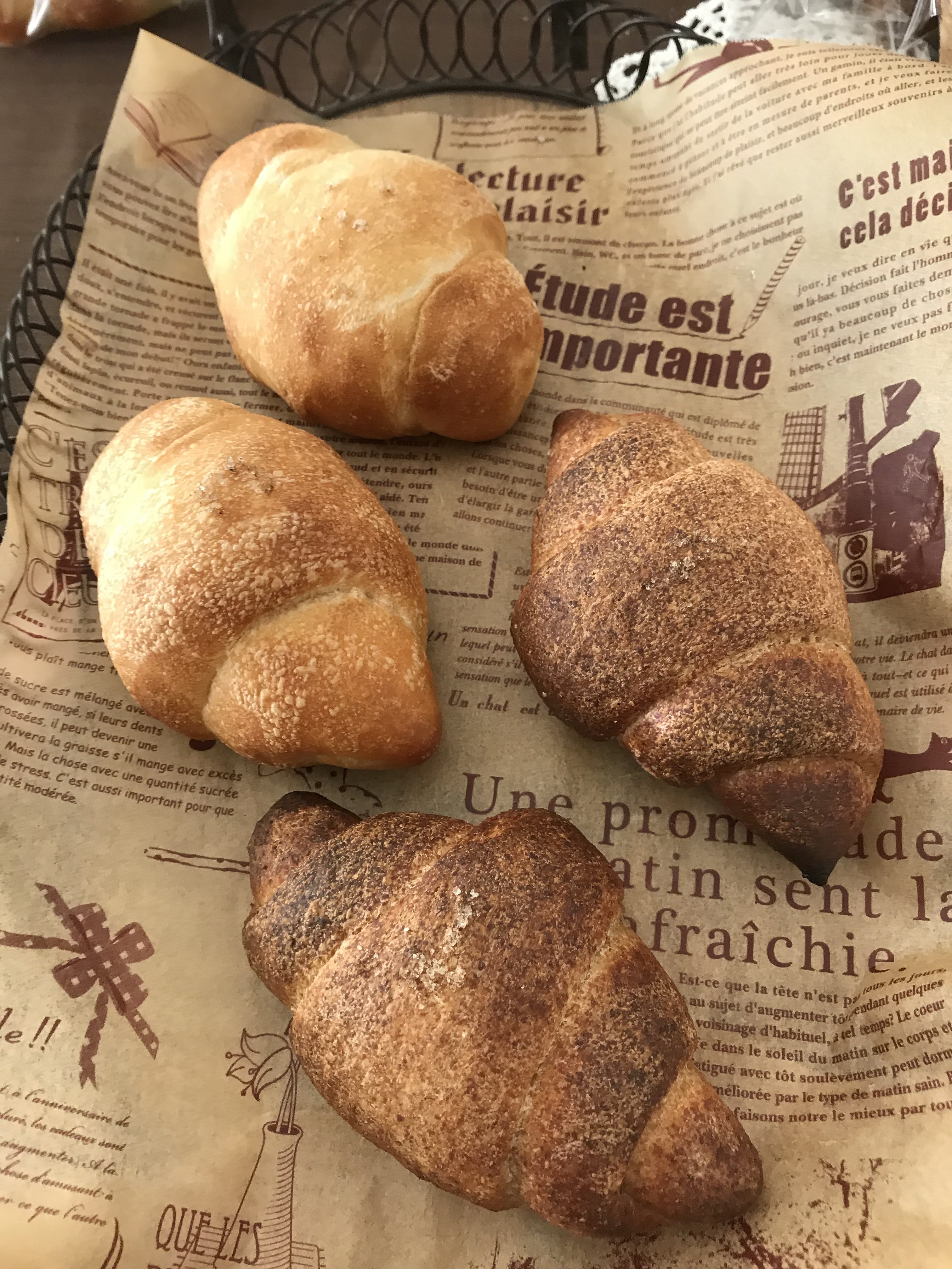 二種類の普通の塩パンとロースト小麦胚芽入りの塩パンを焼きました。右下の二個がロースト小麦胚芽入りです。